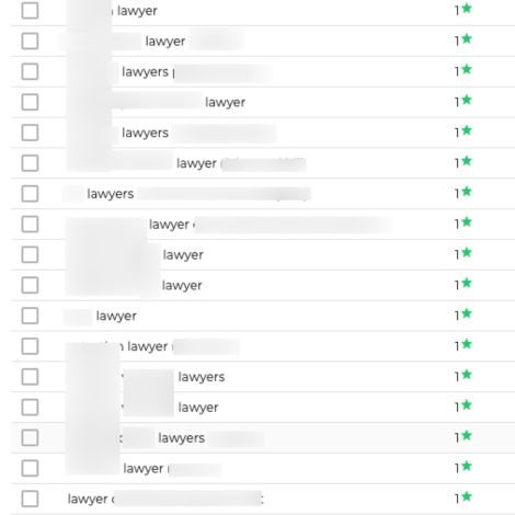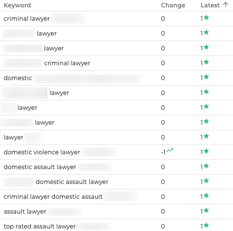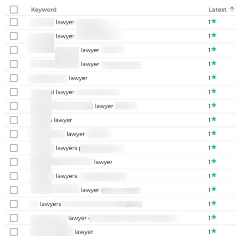 The images above shows a snapshot of keyword rankings from several law firm clients I’ve worked with. Certain keywords and locations have been partially blurred to protect client privacy, but it gives you an idea of the types of legal search terms their websites are ranking for on Google.
